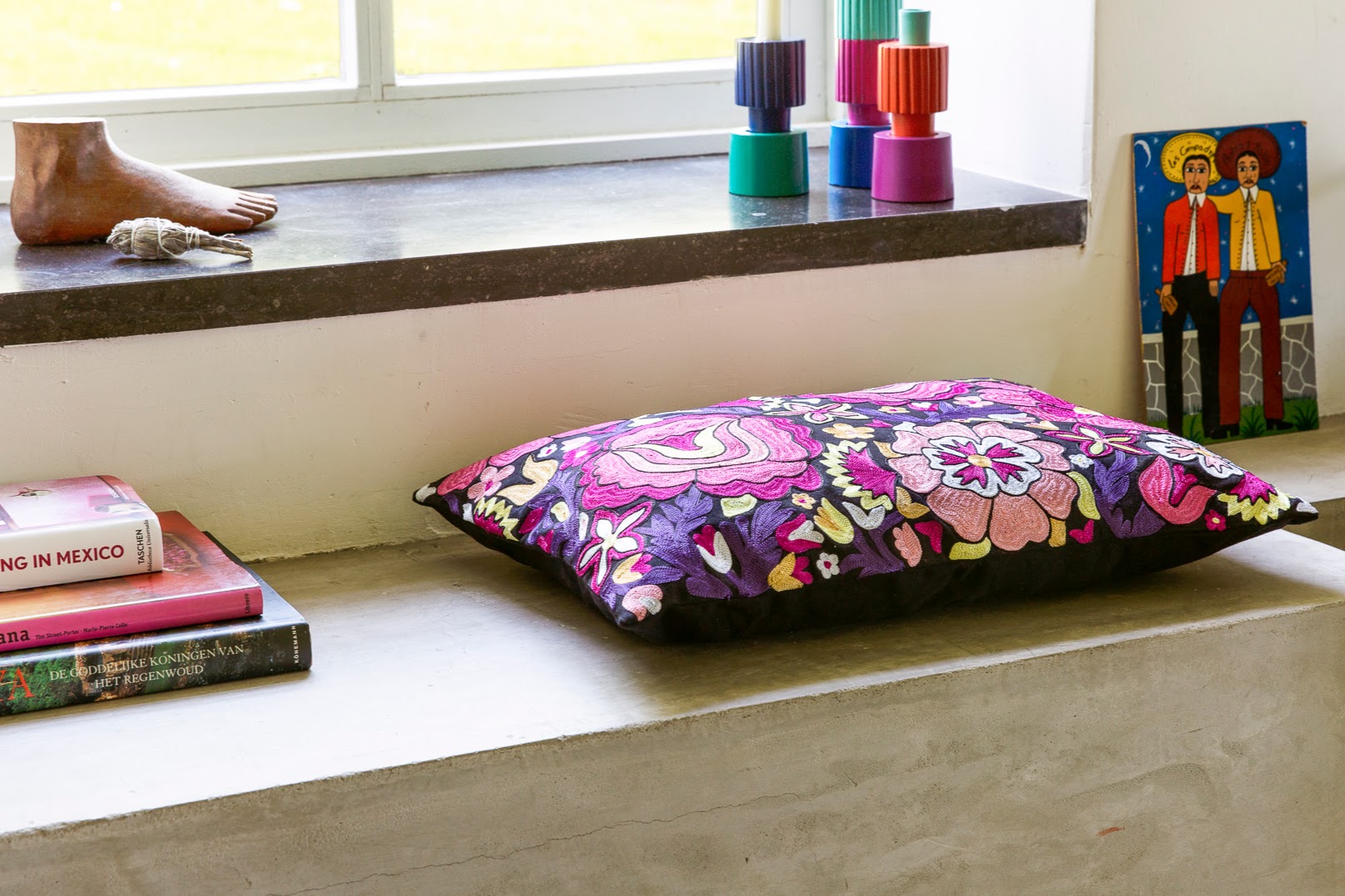 This cotton decorative pillow has a black background full of satin embroidered flowers (flores). The pillow comes including the filling and has a zipper at the back. Dimensions 40 x 60 cm.