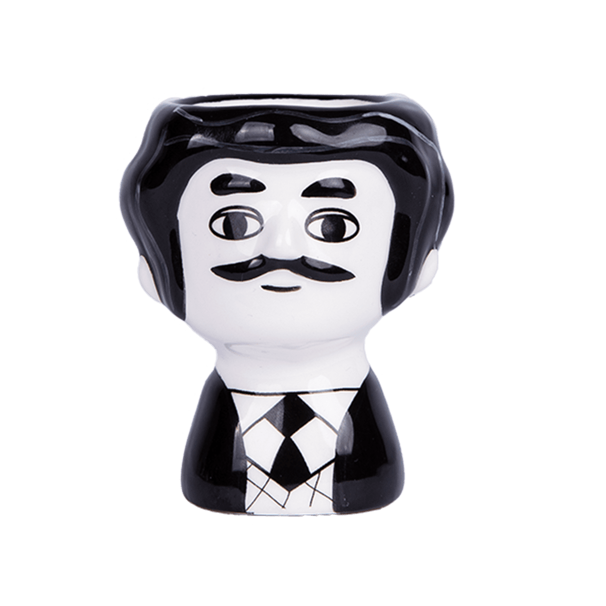 Black and white egg cup set with faces of Carlos and Marisol. Especially designed for Kitsch Kitchen by the Swedish designer Ingela P. Arrhenius. This set is also available in colour.